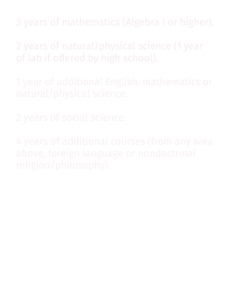 16 Core Courses:3 years of English.2 years of mathematics (Algebra I or higher).2 years of natural/physical science (1 year of labif offered by high school).3 years of additional English, mathematics ornatural/physical science.2 years of social science.4 years of additional courses (from any areaabove, foreign language or nondoctrinalreligion/philosophy).